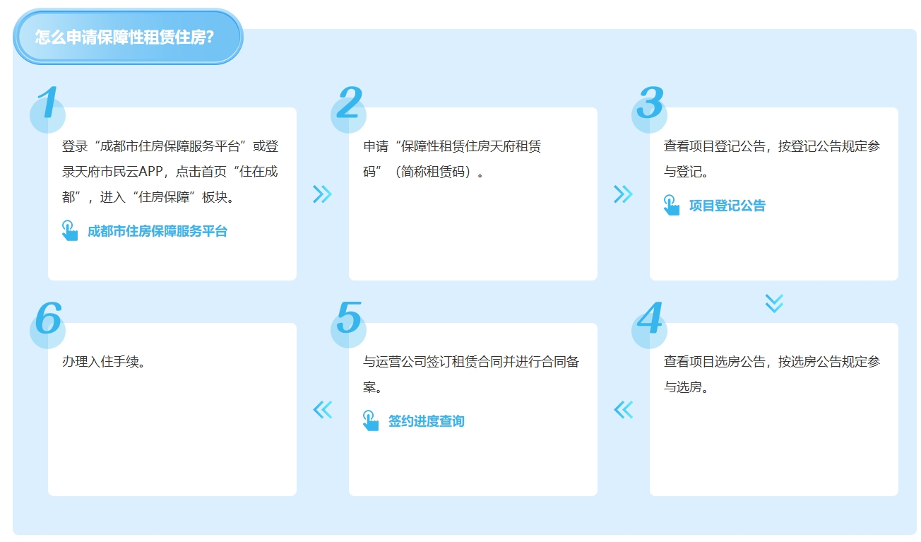 - 按公告公示的选房顺序参与选房,验房后与运营公司签订《成都市保障性租赁住房租赁合同》并完成备案。
